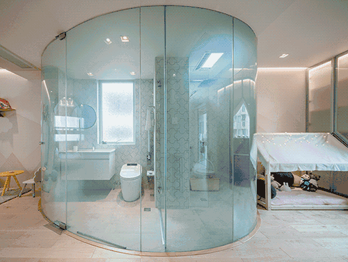 考慮到主衛(wèi)生間的窗戶,是整個房子西面唯一的自然采光,設計師把通電霧化玻璃作為主衛(wèi)生間的墻體材料。從外觀上看,整個主衛(wèi)生間充滿了現(xiàn)代感和科技感,從實用角度來看,衛(wèi)生間白天無人使用時可以保證房間的通亮,洗澡時則可以保證住戶的隱私。