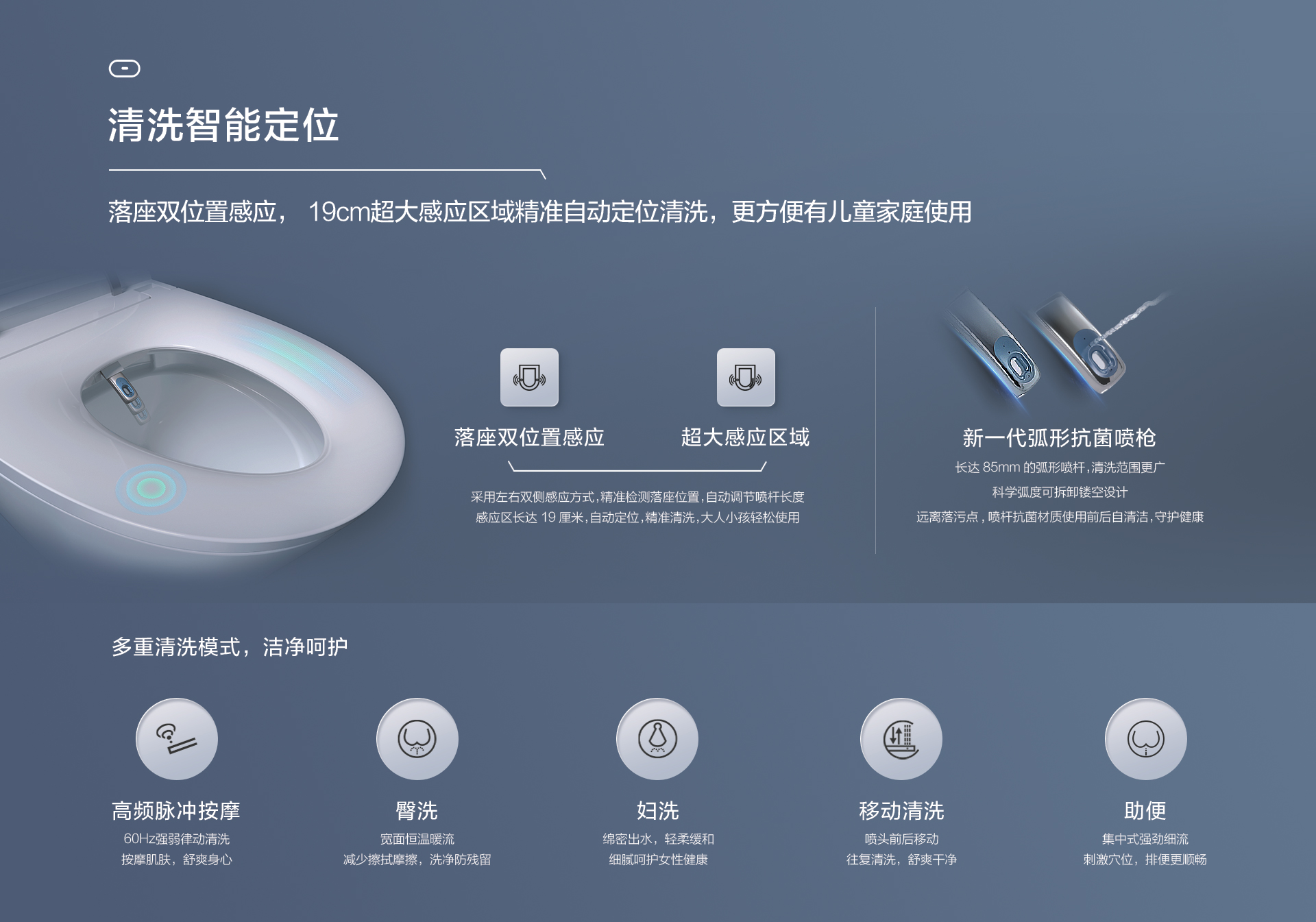 清洗智能定位:落座雙位置感應(yīng),19cm超大感應(yīng)區(qū)域,精準自動定位清洗,更方便有兒童家庭使用